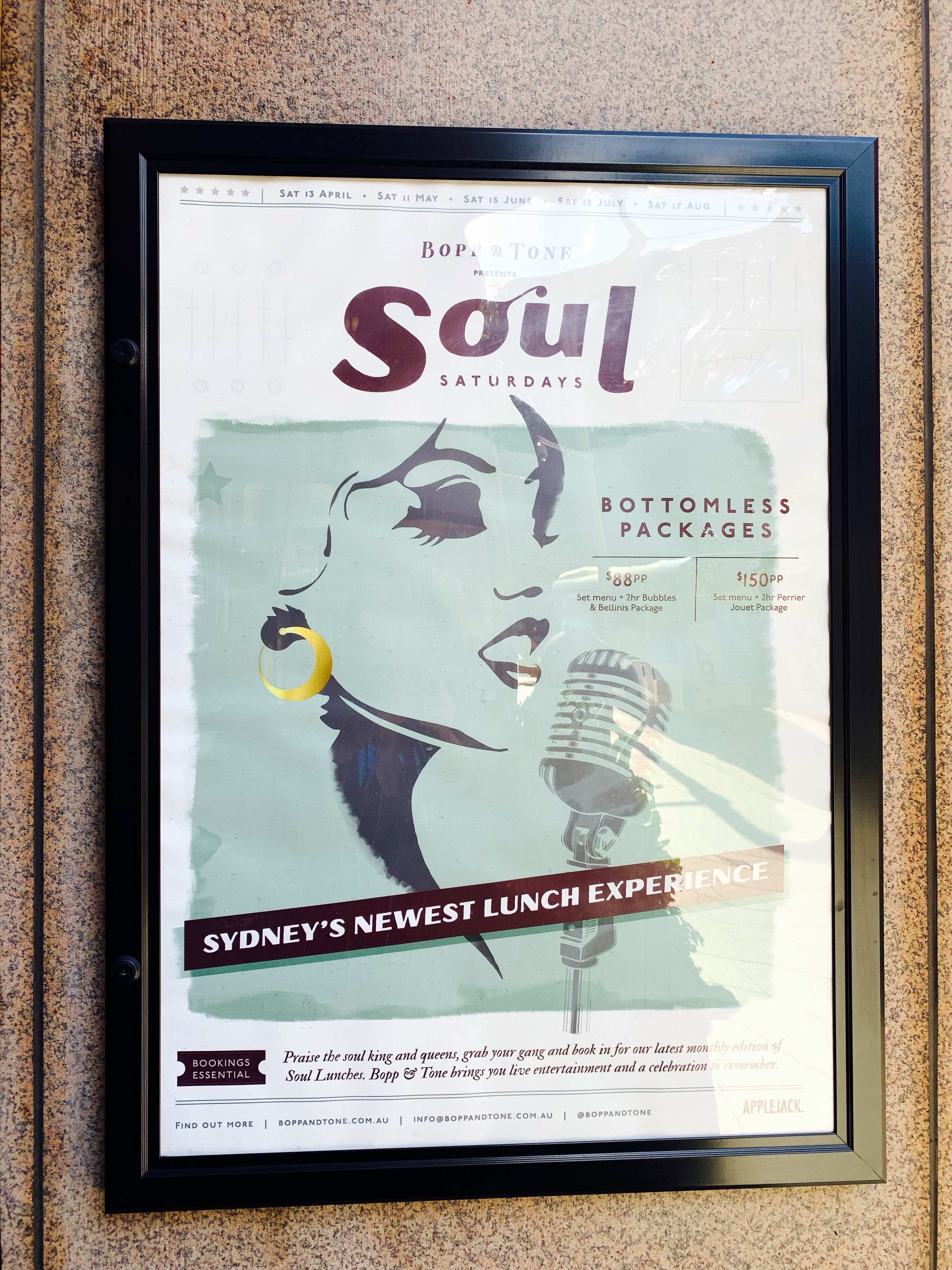 I’d never heard of Bopp & Tone before I started researching for this blog. I booked a table well in advance (3 months to be precise) as they offered Bottomless Perrier Jouet. This is my friend Patricks favorite tiple and he’s always impossibly busy and notoriously hard to pin down. Their bottomless is on every week, however their Soul Saturday in only on once a month and that was what I was interested in. Since then I have followed Bopp & Tone on Instagram, drooling over delicious pictures of their food and decor. Located on Carrington St a short 5 minute walk from Wynyard and a brisk 40 minute walk from my door.
