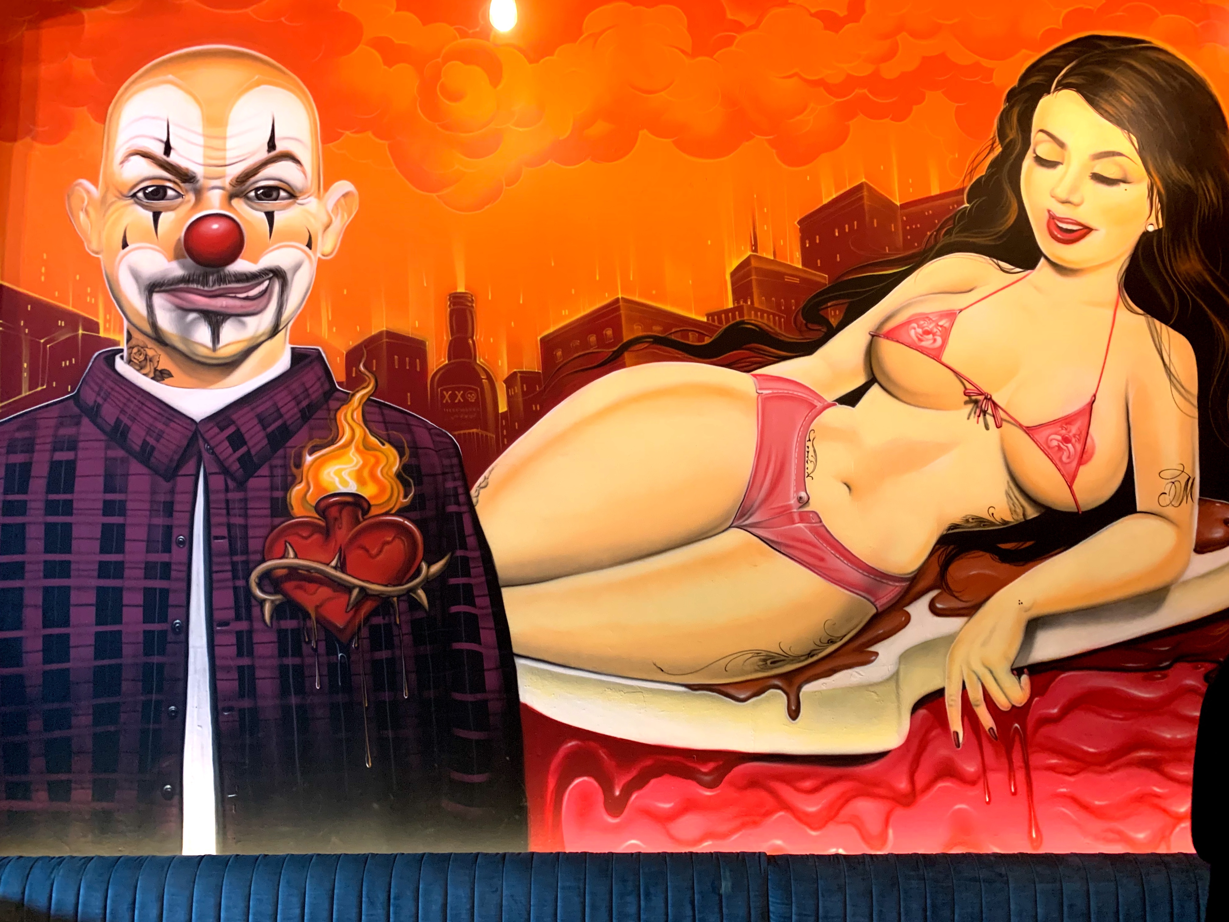 We were seated next to a half naked lady (I later found out this was a rendering of the artists ex wife) and an evil looking clown (Mr Cartoon?) I’m not coulrophobic but every time I see a clown these days I think of Stephen King and Pennywise from IT. The artist, Mister Cartoon is a Los Angeles native who began his career as a graffiti artist before branching into murals, album covers, logos and now tattoos for which he’s most famously known.