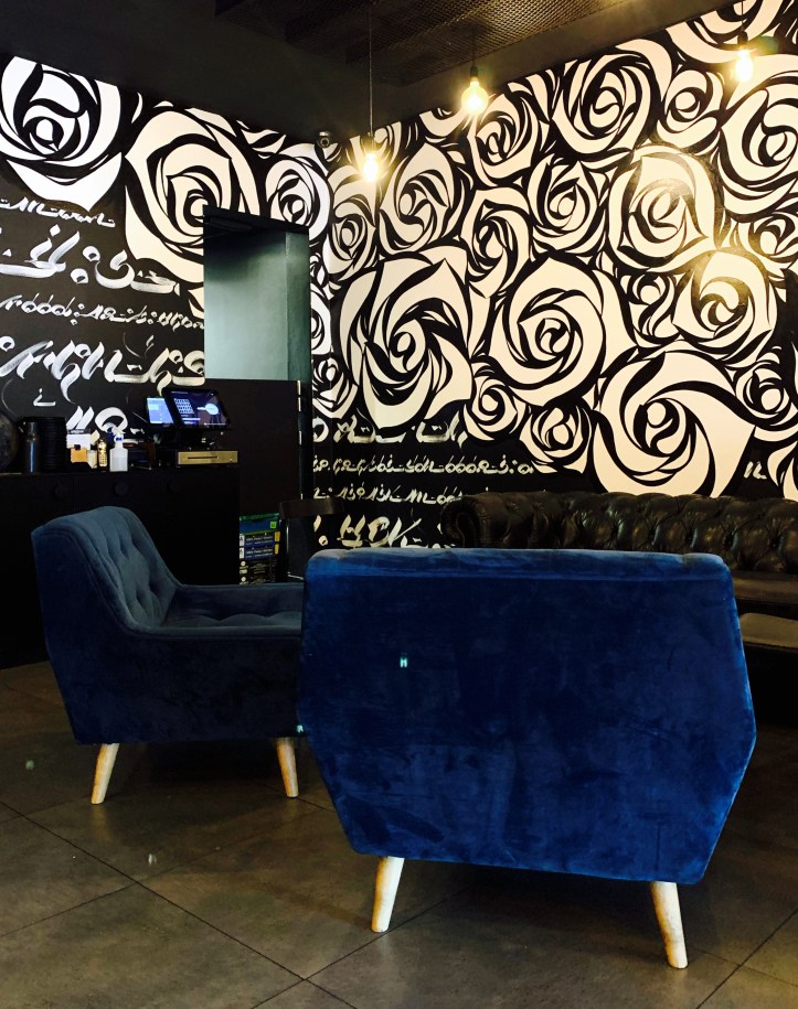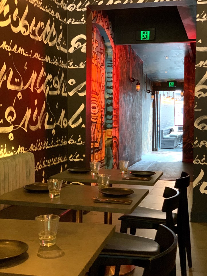 I love the way the artwork and the interiors work together to create different zones in the restaurant. Here the Arabic looking writing on the walls is actually in English. If you look at it at the right angle it says Peanut Butter Jelly and the owner’s name in script.