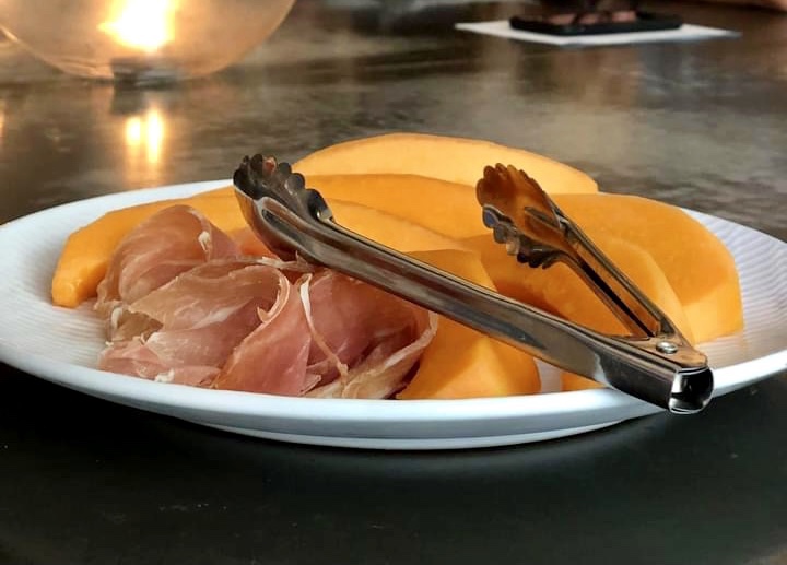Marion had let us know that she’d be 20 minutes late and a text 15 minutes later informed me that Dee & Mitch would also be delayed. Lucky for them Jonny wasn’t being super strict with rule 2. The first item served up was this perfectly ripe rockmelon with prosciutto. I cut the large melon slice into small bite sized pieces, wrapped it in prosciutto and popped it into my mouth. I love the sweetness of the melon mixed with the saltiness of the cured meat. “Mmm rockmelon” I said. “Why do you call it rockmelon?” Adam asked from across the table. “Er, cause that’s its name?” This instantly started a debate about language and country of origin. Do you call it zucchini or courgette? Eggplant or aubergine?